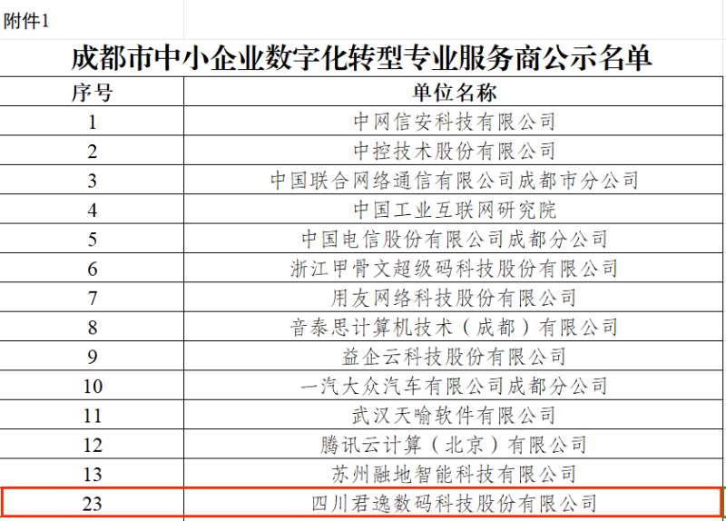 為深入貫徹落實黨中央、國務(wù)院關(guān)于支持中小企業(yè)創(chuàng)新發(fā)展、加快中小企業(yè)數(shù)字化轉(zhuǎn)型系列決策部署,落實《財政部 工業(yè)和信息化部關(guān)于開展中小企業(yè)數(shù)字化轉(zhuǎn)型城市試點工作的通知》文件要求,進一步推進成都市中小企業(yè)數(shù)字化轉(zhuǎn)型城市試點工作,成都市組織開展中小企業(yè)數(shù)字化轉(zhuǎn)型服務(wù)商遴選。經(jīng)企業(yè)申報、區(qū)(市)縣推薦、專家評審、現(xiàn)場答辯等程序,君逸數(shù)碼成功入選成都市中小企業(yè)數(shù)字化轉(zhuǎn)型專業(yè)服務(wù)商。