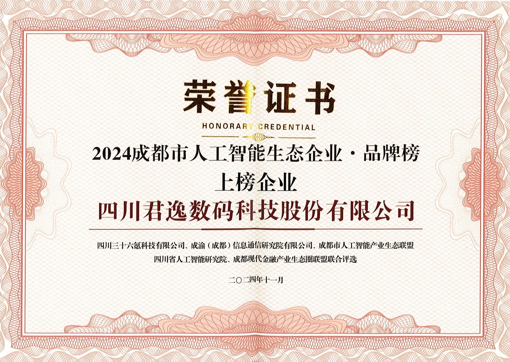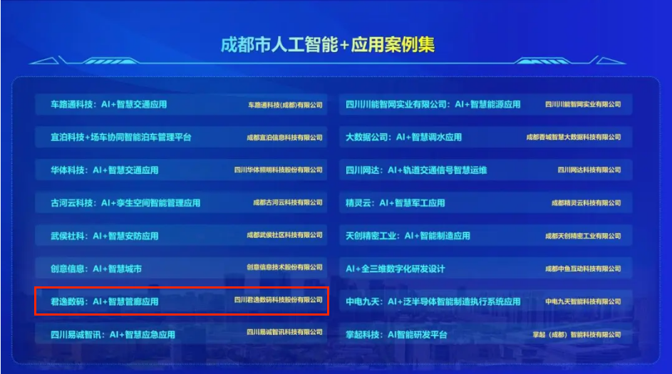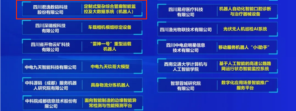 君逸數(shù)碼入選2024成都市人工智能生態(tài)企業(yè)——綜合榜和品牌榜,同時(shí)君逸數(shù)碼在智慧管廊的創(chuàng)新應(yīng)用產(chǎn)品-定制式復(fù)雜綜合管廊智能監(jiān)控及大數(shù)據(jù)系統(tǒng)(機(jī)器人)獲評(píng)成都市人工智能百?gòu)?qiáng)產(chǎn)品。