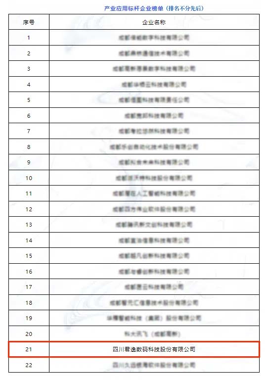 大會現場,成都高新區(qū)人工智能產業(yè)聯盟依據企業(yè)的行業(yè)領導力、技術創(chuàng)新實力、品牌影響力、市場應用成效以及資本市場的關注度等多重標準進行綜合考量,評選出43家聯盟標桿企業(yè),發(fā)布了硬件產品標桿企業(yè)榜單(10家)、產業(yè)應用標桿企業(yè)榜單(22家)、標桿創(chuàng)新平臺榜單(11家)三個榜單。君逸數碼憑借在人工智能領域的創(chuàng)新應用上榜“產業(yè)應用標桿企業(yè)榜單”。
