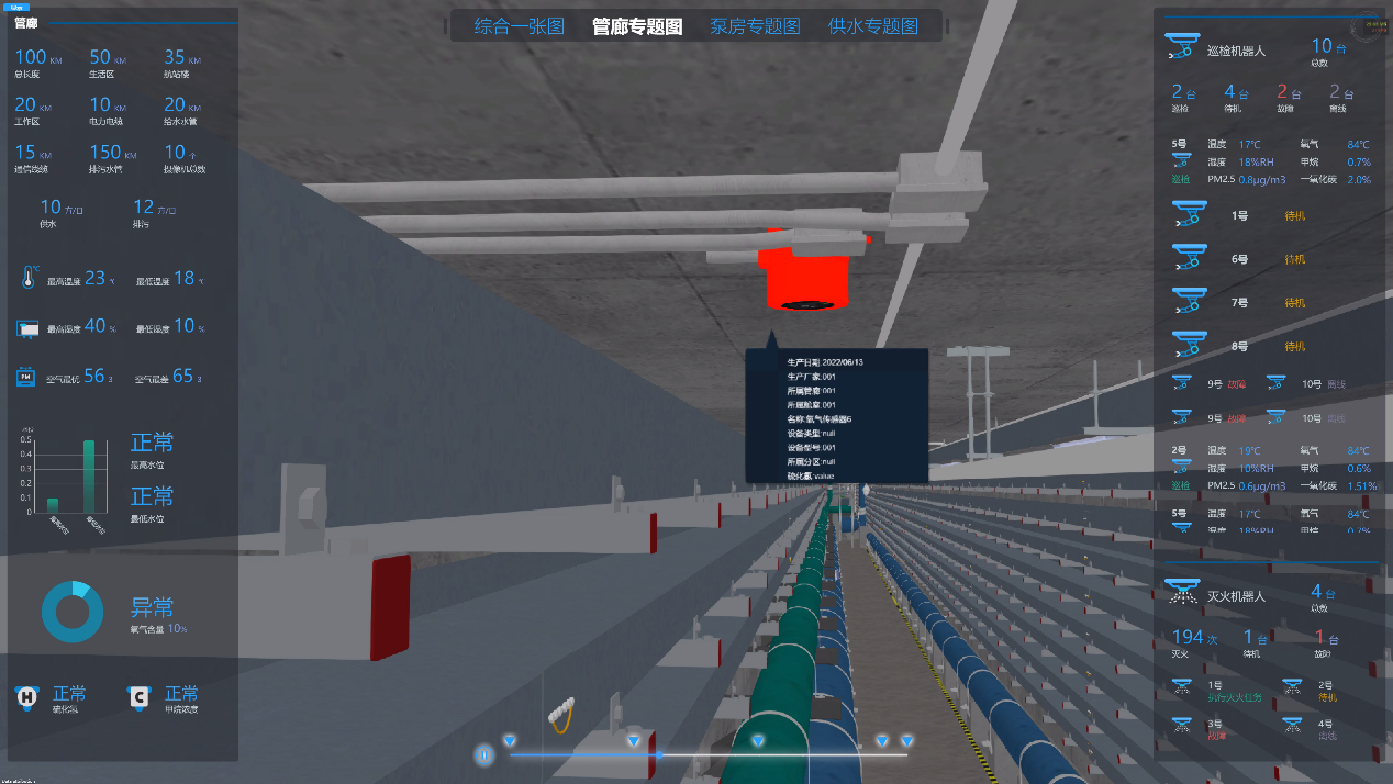 成都市天府國際機場智慧管廊項目涉及工作區(qū) 7.8km 、航站區(qū) 3.05KM、飛行區(qū) 1KM,共計 11.8 公里,還包括東西干道二條下穿隧道和空港三路人行下穿隧道內的弱電監(jiān)控系統(tǒng),其中綜合管廊內涉及綜合倉、電力和冷熱倉的弱電工程大致可分為控制、監(jiān)控及通信系統(tǒng),控制主要對管廊內溫濕度、風機、照明、消防設備和水系統(tǒng)進行調節(jié),監(jiān)控主要涉及巡檢機器人、攝像機視頻和吊裝口的紅外對射,其中也涉及到人員進出口的人臉識別系統(tǒng),管廊內所有控制及監(jiān)控系統(tǒng)全部接入至市政監(jiān)控平臺,以仿真三維圖形展示方式來進行集約化控制和維護,東西干道下穿、視頻監(jiān)控、通信、廣播、信息板及部分市政控制系統(tǒng),隧道內的弱電系統(tǒng)均和 1、2、 3、4 號隧道系統(tǒng)集成一體匯聚至市政監(jiān)控中心。