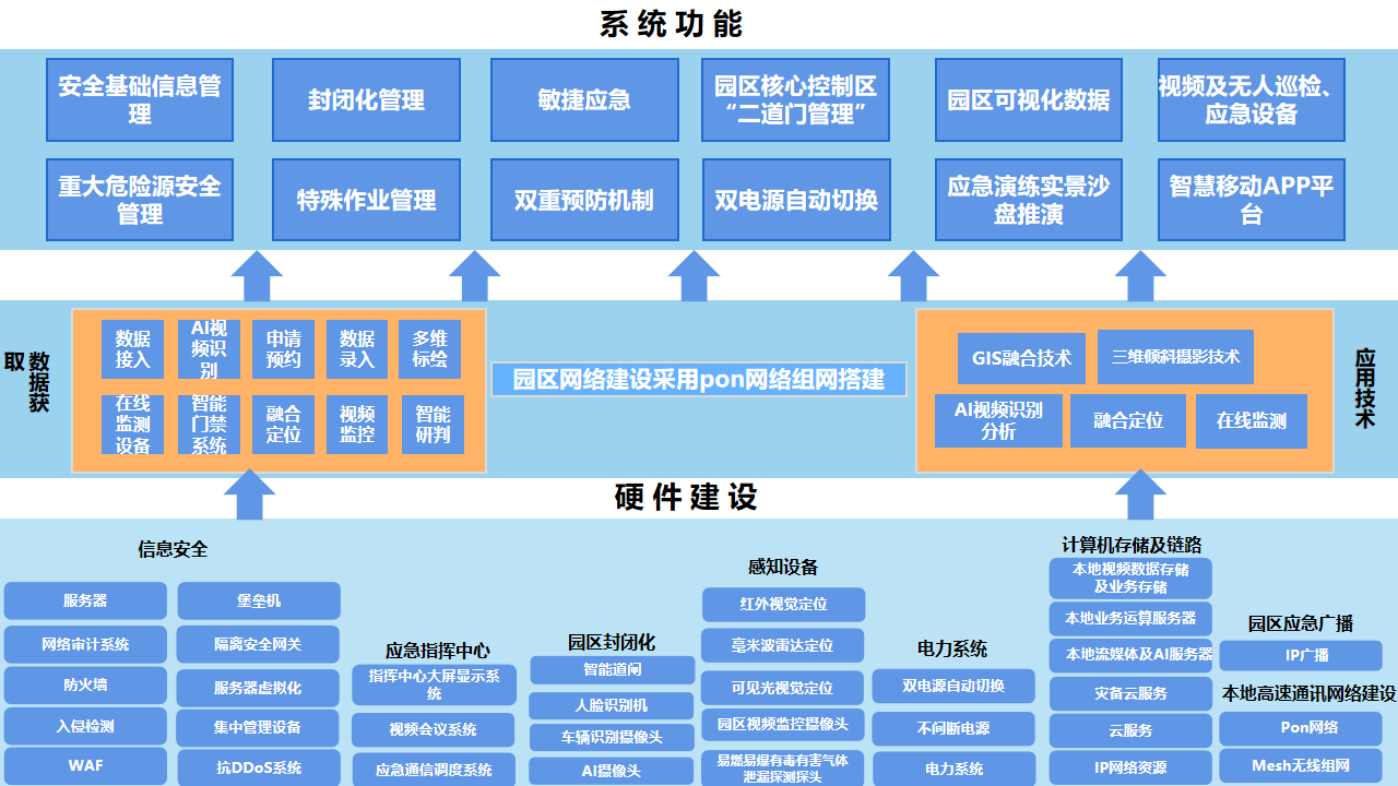根據(jù)《化工園區(qū)安全風(fēng)險(xiǎn)智能化管控平臺(tái)建設(shè)指南》要求,化工園區(qū)信息化平臺(tái)要建設(shè)安全基礎(chǔ)管理、重大危險(xiǎn)源安全管理、雙重預(yù)防機(jī)制、特殊作業(yè)管理、封閉化管理、敏捷應(yīng)急管理等應(yīng)用模塊,建設(shè)化工園區(qū)安全風(fēng)險(xiǎn)智能化管控平臺(tái)、易燃易爆有毒有害氣體泄漏探測和大范圍速掃、園區(qū)數(shù)據(jù)可視化。