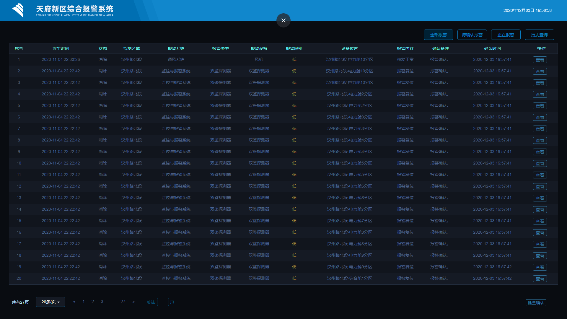 所有設(shè)備的報(bào)警信息及時(shí)提醒,并綜合統(tǒng)計(jì)展示,提供分級(jí)報(bào)警、檢索和分類查看。